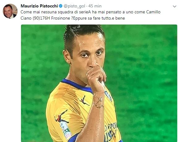 Il moviolista e collega di Premium Sport lo ha notato e non è il solo, perché il talento di Camillo Ciano era già chiaro da qualche anno. Il disappunto di Maurizio Pistocchi nel non veder valorizzato il ragazzo classe 1990, è stato espresso su Twitter dopo il 3-3 del suo Frosinone contro il Pescara nell’anticipo di Serie B. Ciano ha dimostrato di avere classe e duttilità, segnando una doppietta decisiva per regalare il pareggio alla sua squadra.