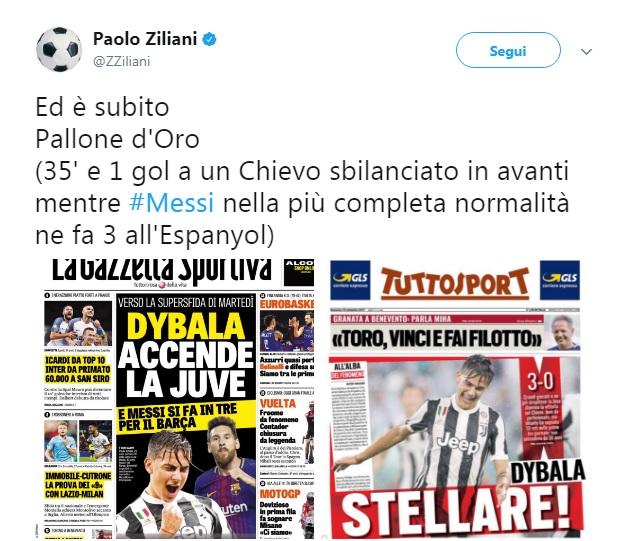 Messaggio a dir poco sarcastico del giornalista Paolo Ziliani che, attraverso il proprio profilo Twitter, pone l’accento sui titoli dei quotidiani odierni che osannano Paulo Dybala.