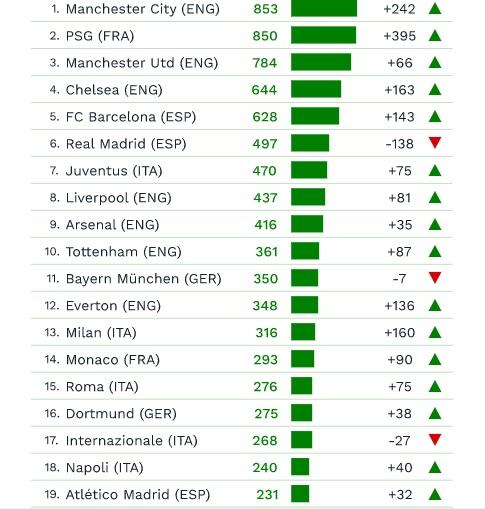 Gli azzurri si piazzano nella top20 con 240 milioni di euro, un gradino in più rispetto all’Atletico Madrid.