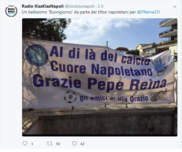 La scritta sulla foto diffusa sul profilo Twitter di Radio Kiss Kiss Napoli: “Al di là del calcio Cuore Napoletano. Grazie Pepe Reina.”
