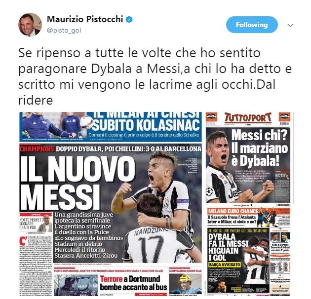Il giornalista Maurizio Pistocchi ha voluto rimarcare quale sia la differenza ancora esistente con un tweet alquanto velenoso: “Se ripenso a tutte le volte che ho sentito paragonare Dybala a Messi,a chi lo ha detto e scritto mi vengono le lacrime agli occhi.Dal ridere“.