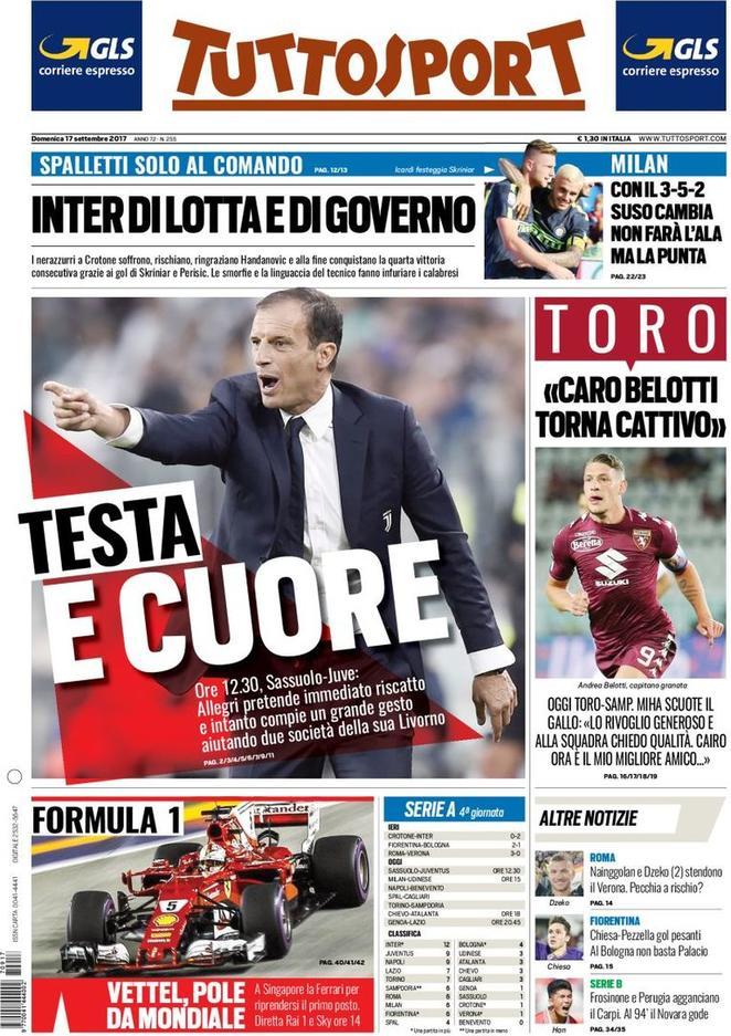 Non c’è spazio per il Napoli su Tuttosport, che si dedica a Sassuolo-Juve. Il Corriere dello Sport, invece, pur complimentandosi con l’Inter, in basso titola: “Napoli-Benevento, derby mai visto“, riferendosi anche alla particolare sfida tra Sarri e Baroni.
