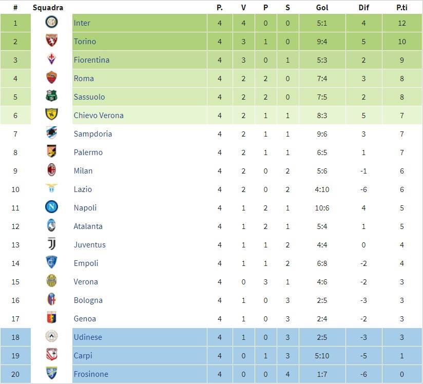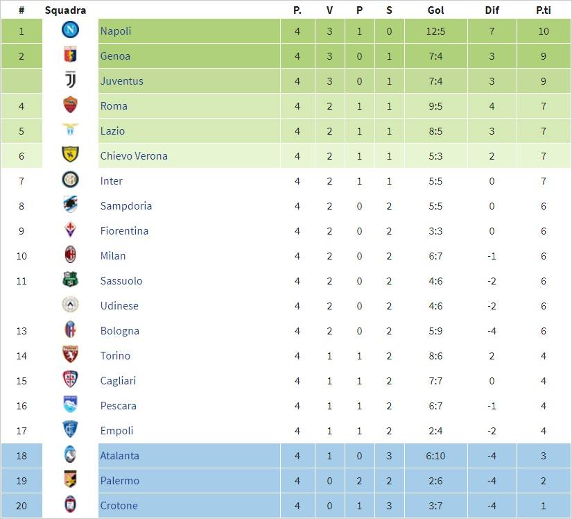 A dire il vero, già nella scorsa stagione la squadra di Sarri si avvicinò alla partenza perfetta, salvo il passo falso nella prima a Pescara, in cui solo l’ingresso di uno scatenato Mertens nella ripresa permise al Napoli di evitare la sconfitta ed iniziare con un pareggio comunque non positivo. Ma dopo le prime 4 giornate di campionato la classifica della scorsa stagione raccontava di un Napoli comunque primo: