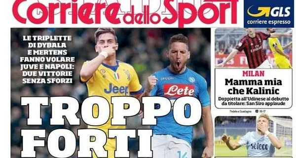Il Corriere dello Sport apre con “Troppo forti (e troppo facile)” riferendosi alle vittorie di Juve e Napoli e le triplette di Dybala e Mertens. Di spalla spazio alle inseguitrici Milan e Lazio che tengono il passo.