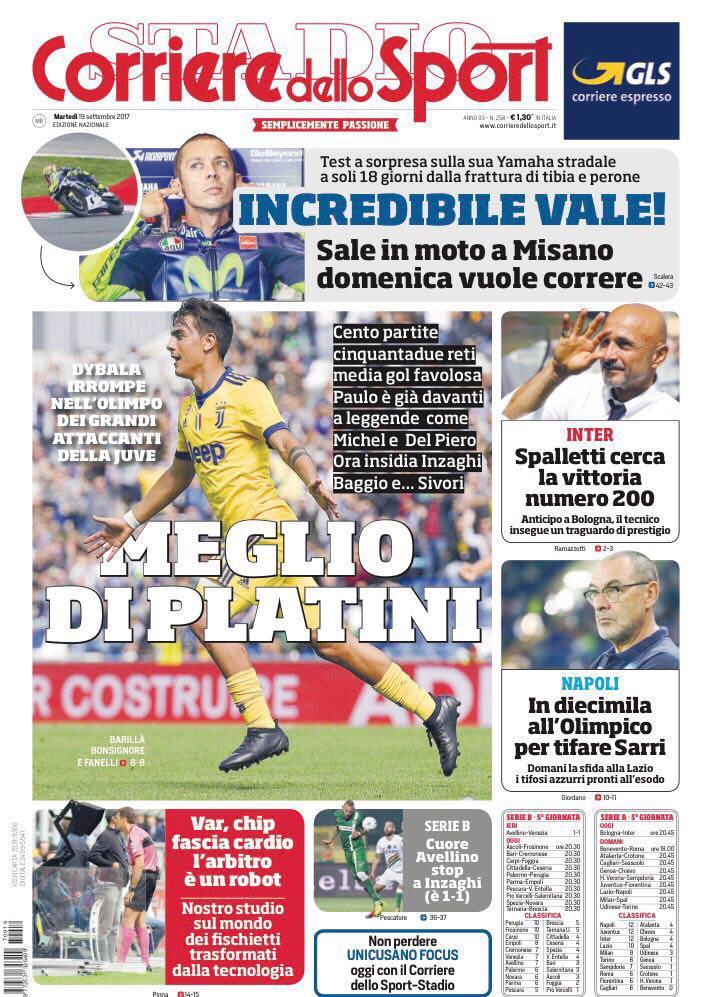 Il Corriere dello Sport apre con: “Meglio di Platini“, facendo il paragone con Dybala ed i suoi numeri in bianconero. Di spalla spazio all’Inter: “Spalletti cerca la vittoria numero 200“, e al Napoli: “In diecimila all’Olimpico per tifare Sarri“.