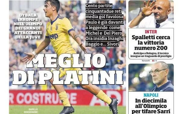 Il Corriere dello Sport apre con: “Meglio di Platini“, facendo il paragone con Dybala ed i suoi numeri in bianconero. Di spalla spazio all’Inter: “Spalletti cerca la vittoria numero 200“, e al Napoli: “In diecimila all’Olimpico per tifare Sarri“.