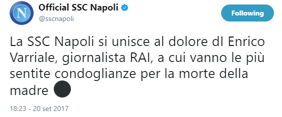La nota recita così: “La SSC Napoli si unisce al dolore di Enrico Varriale, giornalista RAI, a cui vanno le più sentite condoglianze per la morte della madre”.