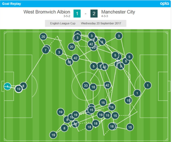 C’è un grafico di Opta Joe che gira in rete dall’altra sera, quando il City ha battuto il West Bromwich Albion in Coppa d’Inghilterra. Pensate un po’: il gol di Sane è arrivato alla fine di 52 passaggi consecutivi da parte di tutti e 11 i calciatori di Guardiola, con zero tocchi degli avversari.