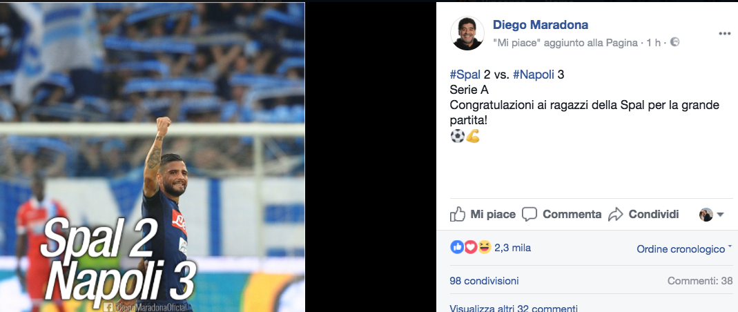 Una foto di Lorenzo Insigne che esulta con il braccio alzato, e poi un messaggio per gli avversari del Napoli, autori di una buona partita: così Diego Armando Maradona si complimenta su Facebook con gli azzurri e con la Spal, dopo la partita di questo pomeriggio.