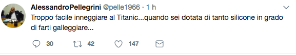 Arriva subito la risposta dell’agente di Maurizio Sarri, Alessandro Pellegrini, che su Twitter scrive: “Troppo facile inneggiare al Titanic…quando sei dotata di tanto silicone in grado di farti galleggiare…”.