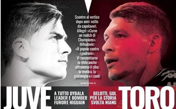 Su Tuttosport apertura dedicata al derby Juve-Torino: “Dipingetelo!“. In taglio basso spazio al Napoli: “Con la Spal per tentare l’allungo. E De Laurentiis fa le… corna“.