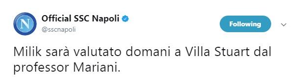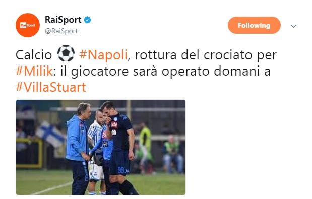 AGGIORNAMENTO 14.55 – Sarebbe peggio del previsto la diagnosi dell’infortunio di Milik. Ad anticiparlo è la RAI che, attraverso il proprio account Twitter, rivela che per l’attaccante polacco si tratta di rottura del crociato. Milik dovrebbe così essere operato domani a Villa Stuart. Si prevede uno stop di almeno 4-5 mesi.