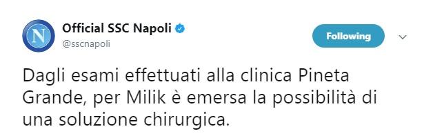 Sul profilo Twitter della società partenopea è stato infatti diffuso un comunicato che preannuncia la possibilità di intervenire chirurgicamente sul ginocchio del polacco: “Dagli esami effettuati alla clinica Pineta Grande, per Milik è emersa la possibilità di una soluzione chirurgica. Milik sarà valutato domani a Villa Stuart dal professor Mariani”.