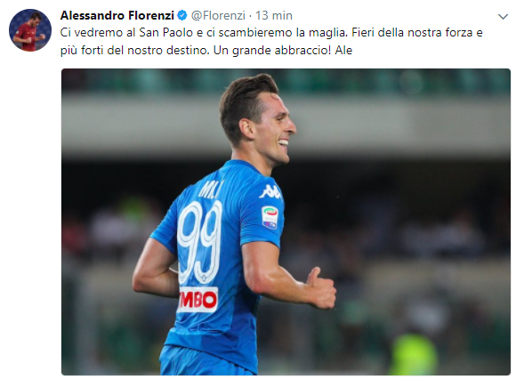 “Ci vedremo al San Paolo e ci scambieremo la maglia. Fieri della nostra forza e più forti del nostro destino. Un grande abbraccio! Ale”