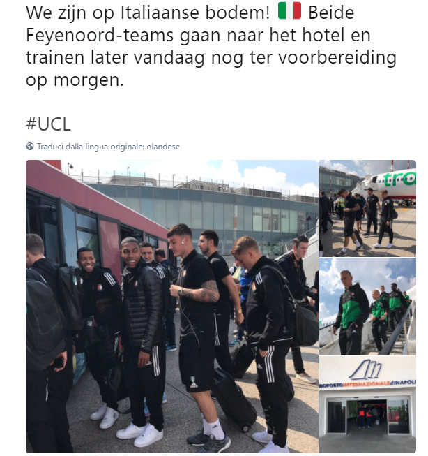 Il Feyenoord arriva a Napoli in vista della gara di domani di Champions League e lo annuncia tramite Twitter.