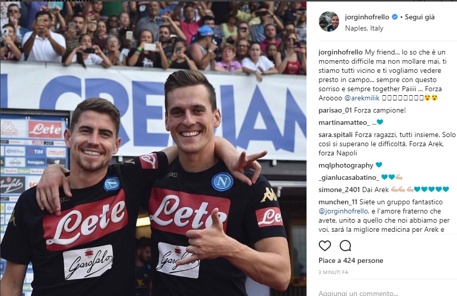 I compagni del gigante polacco però non hanno fatto mancare il proprio sostegno, anche attraverso i propri profili social. Ultimo in ordine cronologico è il post di Jorginho su Instagram, che incoraggia il compagno a tornare presto in campo, sempre e comunque con il sorriso.