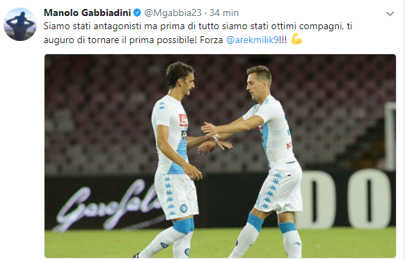 Dall’Inghilterra il primo a fare gli auguri di pronta guarigione ad Arek Milik è Manolo Gabbiadini, suo ex compagno di squadra al Napoli.