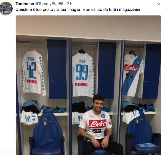 Un augurio speciale gliel’ha fatto, a nome di tutti i magazzinieri, Tommaso Starace, con uno splendido tweet: “Questo è il tuo posto , la tua maglia e un saluto da tutti i magazzinieri”
