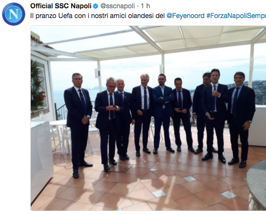 A dimostrazione del rispetto e dell’accoglienza rivolta agli olandesi, arriva il tweet dal profilo ufficiale del Napoli al termine del pranzo con la dirigenza del Feyenoord. “Il pranzo Uefa con i nostri amici olandesi del Feyenoord”, questa è la frase che accompagna la foto delle due dirigenze.
