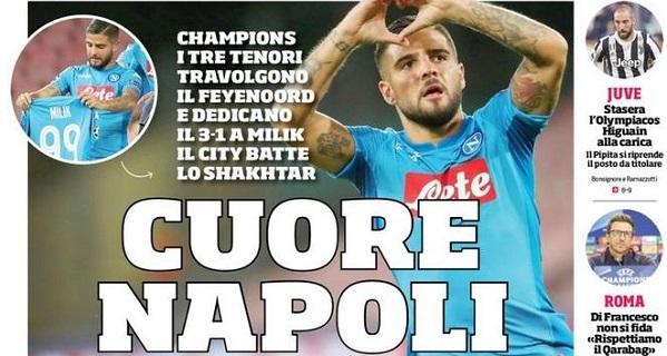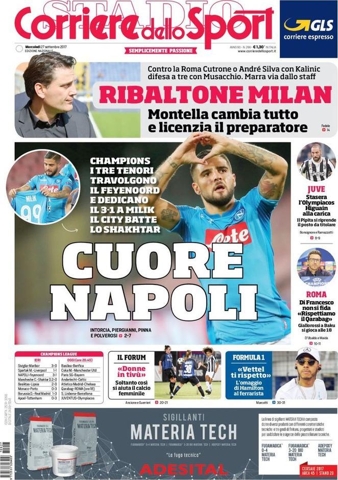 Il Corriere dello Sport titola con: “Cuore Napoli“. I tre tenori travolgono il Feyenoord e dedicano il 3-1 a Milik. In alto spazio al: “Ribaltone Milan“. Montella cambia tutto e licenzia il preparatore. Di spalla si parla di Juventus: “Stasera l’Olympiacos, Higuain alla carica”. E Roma con Di Francesco che non si fida: “Rispettiamo il Qarabag”.