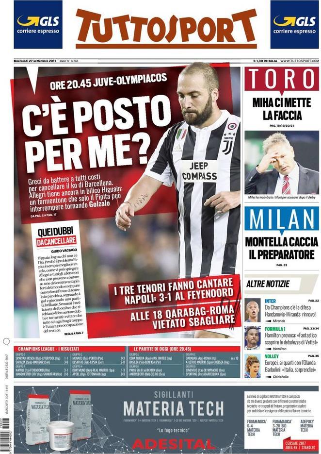 Tuttosport apre con Higuain e la domanda che sembra porsi l’argentino: “C’è posto per me?“. Poi si parla di Napoli con: “I tre tenori fanno cantare gli azzurri: 3-1 al Feyenoord“. Poi terza italiana in Champions con la Roma che alle 18 incontra il Qarabag. Di spalle si parla di Milan e: “Montella che caccia il preparatore” e Torino con: “Mihajlovic che ci mette la faccia“.