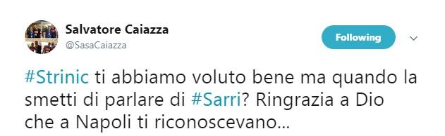 A queste critiche ha voluto rispondere il giornalista Salvatore Caiazza con un messaggio su Twitter: “Strinic ti abbiamo voluto bene ma quando la smetti di parlare di Sarri? Ringrazia a Dio che a Napoli ti riconoscevano…“.