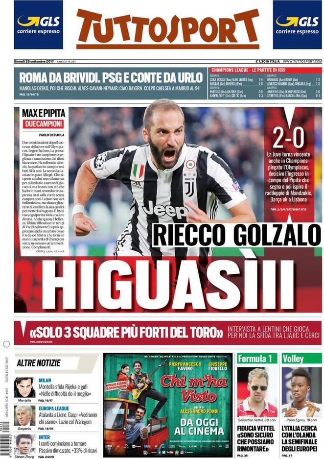 Tuttosport apre con: “Higuasìii, riecco Golzalo“. In taglio alto ancora Champions: “Roma da brividi, PSG e Conte da urlo“. In taglio basso le italiane impegnate in Europa League con approfondimenti su Milan e Atalanta.