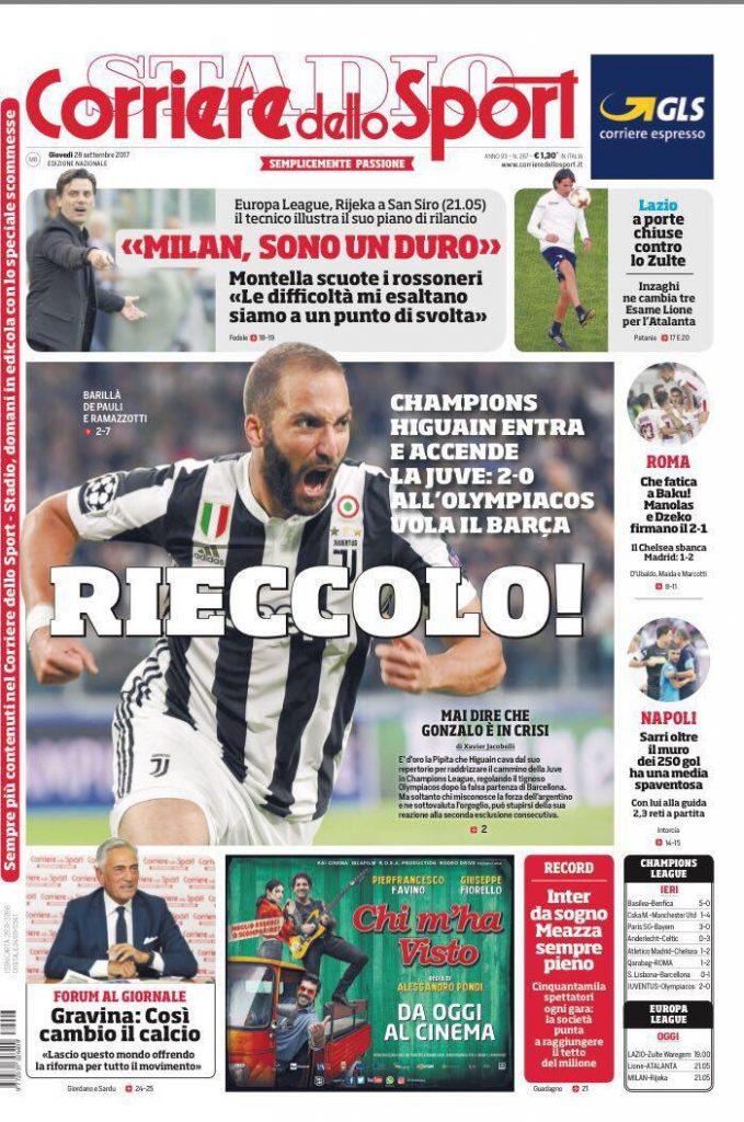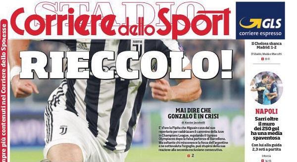 Il Corriere dello Sport apre con la Juve e Higuain: “Rieccolo!“. In taglio alto l’Europa League con Milan, Lazio e Atalanta. Di spalla spazio anche al Napoli: “Sarri oltre il muro dei 250 gol, ha una media spaventosa“.