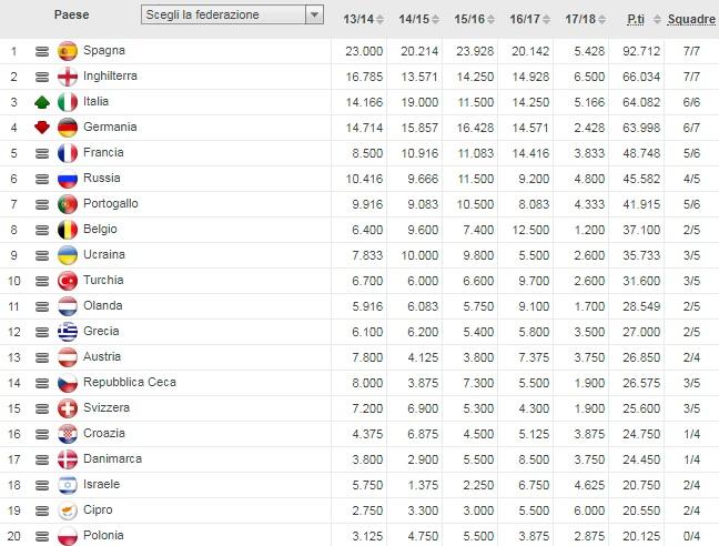 RANKING COMPETIZIONI CLUB: