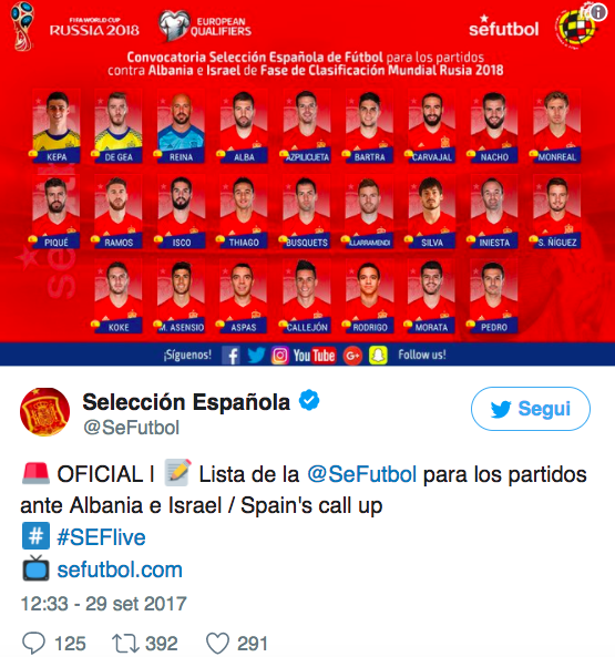 José Callejon ritrova la Nazionale: dopo le splendide partite giocate nel Napoli in questo inizio di stagione, il ct spagnolo Lopetegui lo convoca per i match con Albania e Israele, che molto probabilmente sanciranno l’ufficialità della partecipazione al Mondiale in Russia delle furie rosse. Convocato anche Pepe Reina.