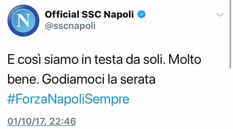 “E così siamo in testa da soli. Molto bene. Godiamoci la serata #ForzaNapoliSempre“.