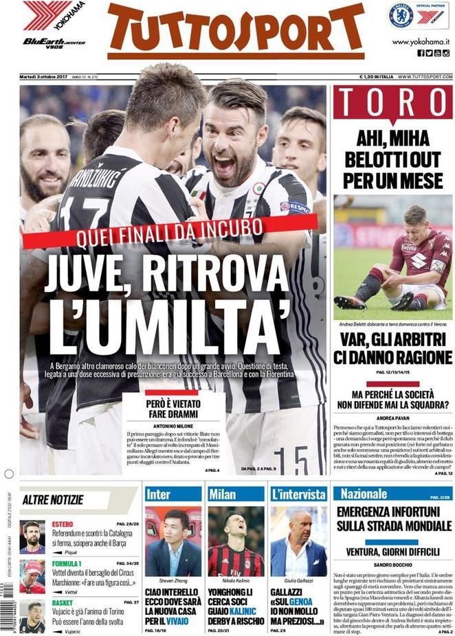 Tuttosport titola: “Juve, ritrova l’umiltà“. Di spalla ecco il Torino: “Ahi, Miha. Belotti out per un mese“. Ancora VAR anche sul quotidiano torinese e poi in basso ecco i boxini dedicati al calcio esterno, all’Inter, al Milan e alla Nazionale.