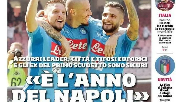 Il Corriere dello Sport titola in prima pagina: “È l’anno del Napoli“, in base ai pareri degli ex calciatori del primo scudetto azzurro. In taglio alto “Vince il VAR“, mentre in basso ecco il Milan: “Il futuro si chiama Conte. Confermata la fiducia a Montella fino al derby“. Spazio anche alla Roma e alla Serie B con il posticipo di Frosinone.