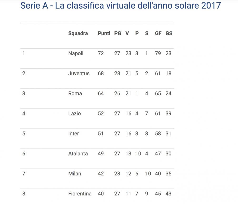 Questa la nota riportata sul sito UEFA: “I Partenopei sono primi anche nella classifica virtuale del campionato italiano del 2017: 72 punti conquistati in 27 gare giocate, quattro punti in più rispetto alla Juventus, che ha oltretutto disputato una partita in più, il recupero della sfida contro il Crotone slittata nel dicembre 2016 per l’impegno in Supercoppa italiana contro l’AC Milan. La squadra di Sarri ha vinto ben 23 gare, pareggiandone 3 e perdendone solo una, il 25 febbraio per 0-2 nella sfida interna contro l’Atalanta. Un cammino impressionante, merito soprattutto di un attacco formidabile in grado di realizzare complessivamente ben 79 reti, 14 in più rispetto all’AS Roma e 18 in più rispetto alla Juventus, ma anche di un difesa che ha incassato 23 gol, solo 5 in più rispetto alla Juventus. Dati che dimostrano come il Napoli abbia trovato continuità di risultati quest’anno e che fanno sognare i tifosi partenopei”.