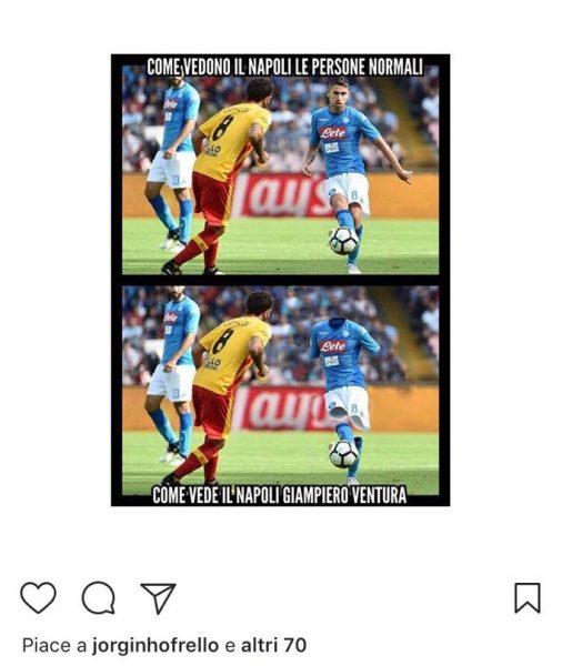 In uno di questi si legge: “Come vedono il Napoli le persone normali” con foto di Jorginho, e: “Come vede il Napoli Ventura” con foto di Jorginho invisibile. Il post ha avuto il “like” dello stesso calciatore su Instagram. Un modo per manifestare l’incredulità alle decisioni del mister della Nazionale?