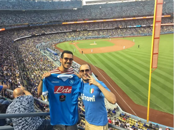 Arrivano fino a Los Angeles i colori azzurri, grazie a questa coppia di tifosi che celebra le maglie azzurre (del presente e del passato) al Dodger Stadium della città degli angeli.
