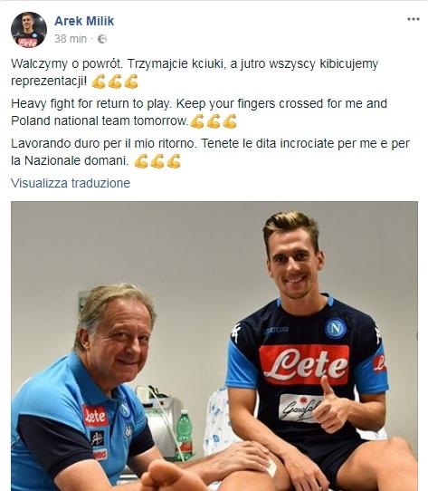 Non manca l’entusiasmo per l’attaccante polacco che, attraverso i propri profili social, ha voluto mandare un messaggio ai tifosi: “Lavorando duro per il mio ritorno. Tenete le dita incrociate per me e per la Nazionale domani. 💪💪💪“.