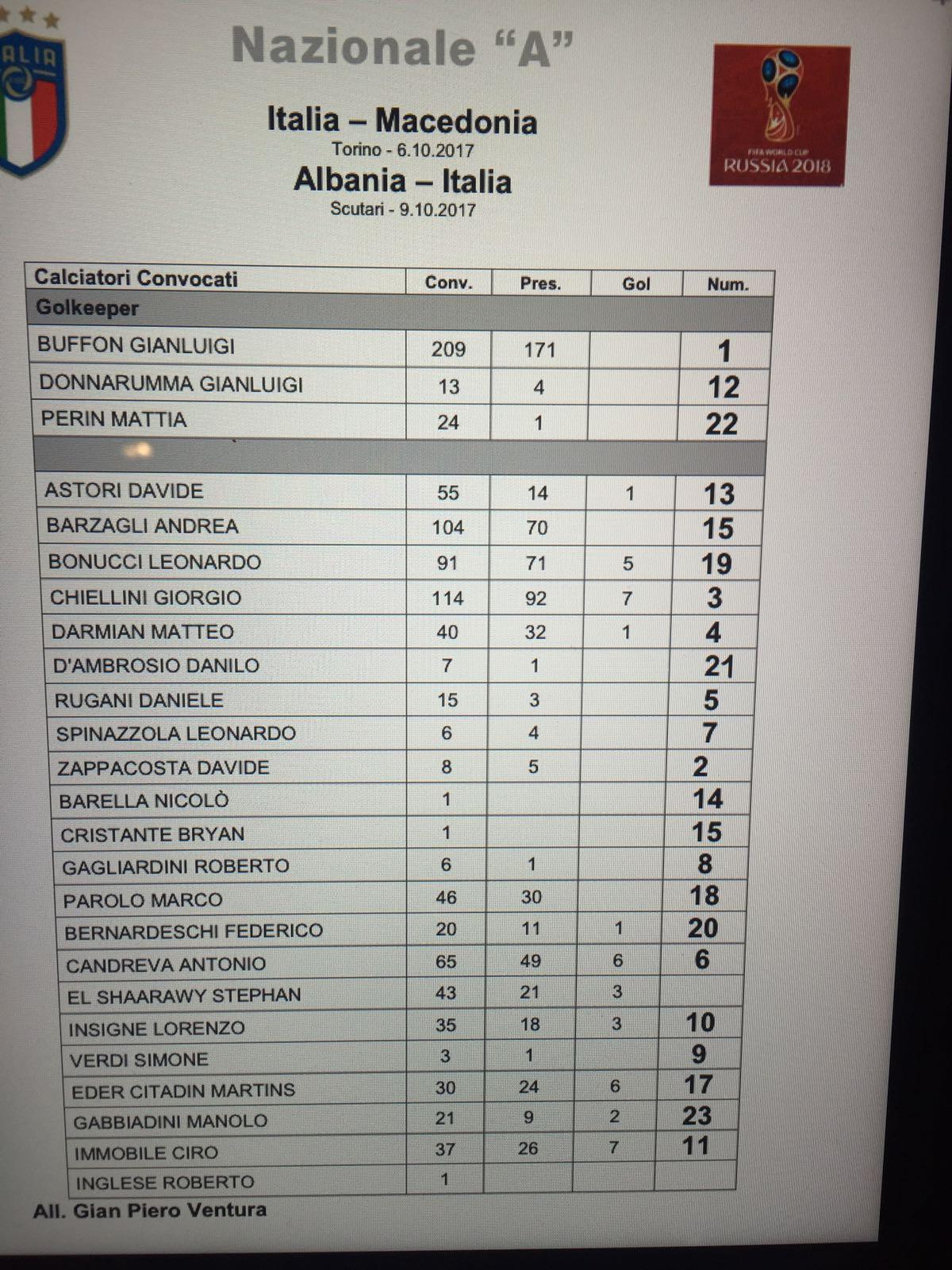 Come riportato dal sito di Gianluca Di Marzio, i calciatori della Nazionale italiana hanno scelto i numeri di maglia per la doppia sfida contro Macedonia e Albania.