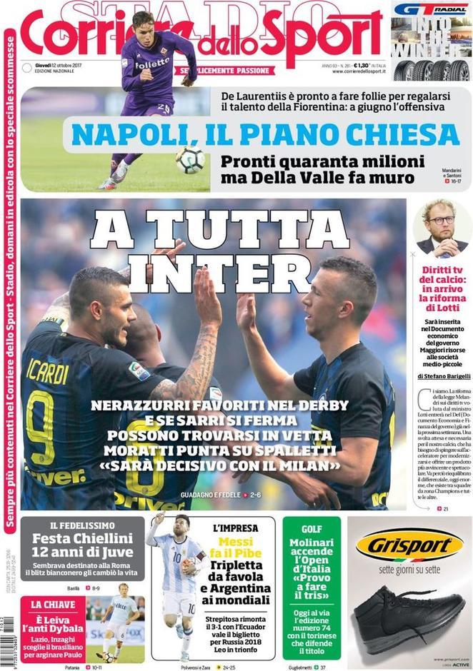 Il Corriere dello Sport invece illustra il piano del Napoli per arrivare a Federico Chiesa, gioiello della Fiorentina ed astro nascente del calcio nostrano. Della Valle, si legge in prima pagina, fa muro, ma il Napoli ha pronti quaranta milioni da offrire sul piatto. Spazio anche al derby di Milano e ai dodici anni di Giorgio Chiellini in bianconero.