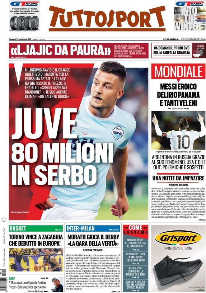 Tuttosport si focalizza, come spesso avviene, sulla Juventus e sul piano per Milinkovic-Savic, il centrocampista serbo in forza alla Lazio che ha stregato tutti, in Serie A e non solo. Un piano da ottanta milioni, si legge, per strappare a Lotito le prestazioni del ragazzo. Spazio anche alla notte folle del calcio sudamericano, con polemiche e sorprese per gli esiti delle qualificazioni per Russia 2018. Ampio spazio a Leo Messi, l’eroe che ha trascinato l’Argentina al Mondiale.