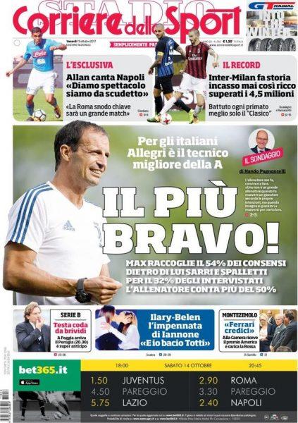 Il Corriere dello Sport apre con un sondaggio sugli allenatori di Serie A: “Allegri il più bravo! Dietro di lui Sarri e Spalletti“. In taglio alto intervista ad Allan: “Canta Napoli! Diamo spettacolo, siamo da scudetto“. Infine spazio al derby di Milano.