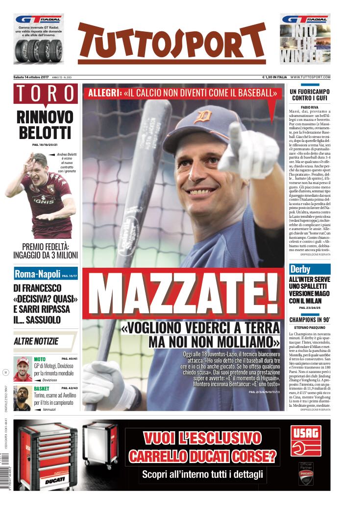 Le parole di Allegri, invece, su Tuttosport: “Vogliono vederci a terra, ma noi non molliamo”. Accenno a Roma-Napoli con la considerazione di Di Francesco: “Sfida decisiva? Quasi”.