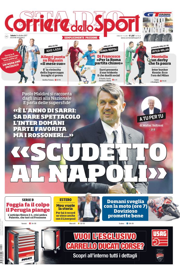 Nello specifico, il Corriere dello Sport apre con un’intervista a Maldini che tuona: “Scudetto al Napoli, è l’anno di Sarri”.