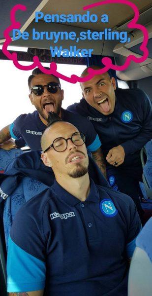 Tra le varie immagini spicca quella di Sepe, pubblicata tramite le storie di Instagram, in cui prende in giro un dormiente Hamsik insieme ad Insigne.