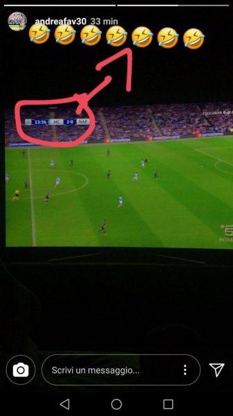 Favilli, nella sua Instagram Story, ha “deriso” la scelta del turn-over, evidenziando il risultato sul 2-0 ed aggiungendo le emoticon che riproducono la risata, come potete notare dalle foto in basso.