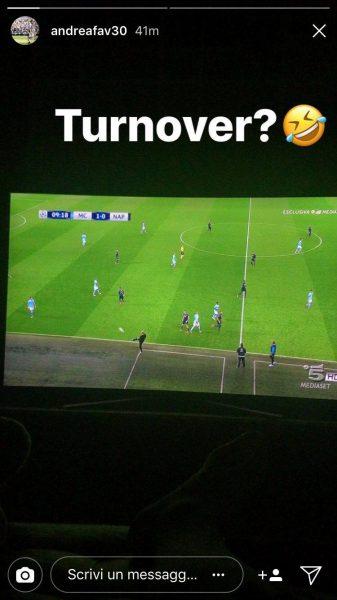 Favilli, nella sua Instagram Story, ha “deriso” la scelta del turn-over, evidenziando il risultato sul 2-0 ed aggiungendo le emoticon che riproducono la risata, come potete notare dalle foto in basso.