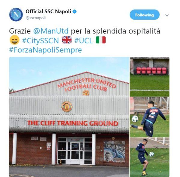 A confermalo è stato lo stesso Napoli che ha poi ringraziato con un tweet: “Grazie @ManUtd per la splendida ospitalità 😄 #CitySSCN 🇬🇧 #UCL 🇮🇹 #ForzaNapoliSempre“.