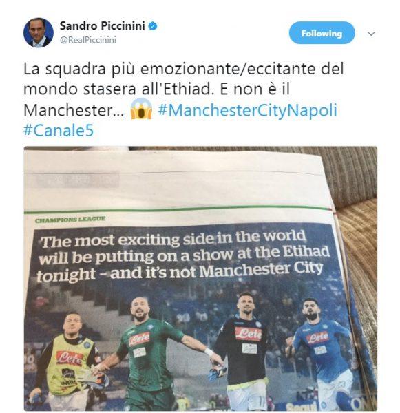 “La squadra più emozionante/eccitante del mondo stasera all’Ethiad. E non è il Manchester… 😱 #ManchesterCityNapoli #Canale5“, questo il tweet di Piccinini che traduce il titolo del quotidiano.
