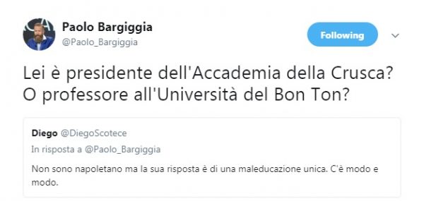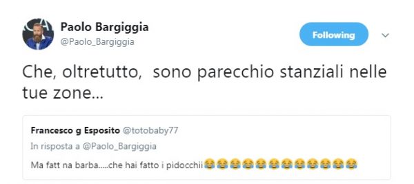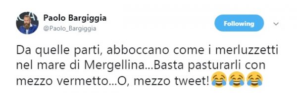 AGGIORNAMENTO 14.00 – Il tweet di questa mattina di Paolo Bargiggia nei confronti di Sarri ha, come era prevedibile, fatto scattare l’ira dei tifosi napoletani che sui social hanno inveito contro il giornalista. Bargiggia così ha risposto con messaggi sempre più provocatori e, in qualche caso, anche altamente offensivi verso il popolo partenopeo.