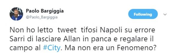 “Non ho letto tweet tifosi Napoli su errore Sarri di lasciare Allan in panca e regalare il campo al #City. Ma non era un Fenomeno?“.